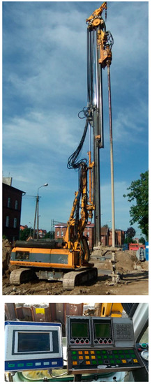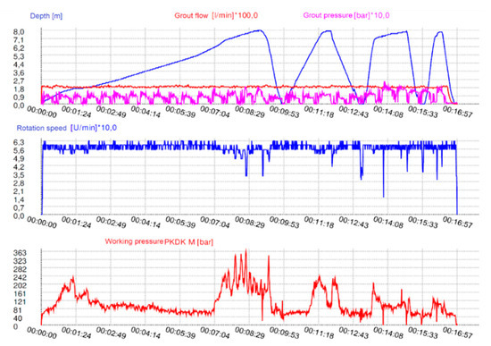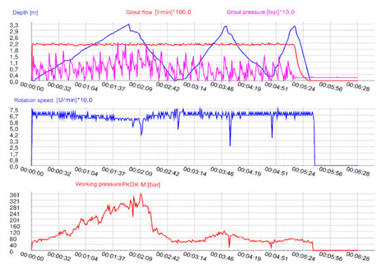 The assurance of a high quality of work is fundamental. As the soil mixing is conducted in situ, the equipment and the documentation of the works using advanced production parameters recording systems play a very significant role. Depending on the number and type of sensors mounted on the device, we can get several values describing the process of penetration of the agitator into the ground. Such a procedure allows for large possibilities pertaining to current analysis and interpretation of the works, especially in correlation with the available and complementary soil investigations, particularly with the use of static probes (Figure 1) [9,15]. Current extensive systems allow the registration of parameters such as operating pressure, rotational speed, torque, pressure force, feed speed, or penetration resistance as well as their correlation as a function of depth (Figure 2). The requirements in that respect, listed in the designs and technical specifications, should correspond to good practice standards, which require tracking the development of technologies and cooperation with DSM works contractors. Especially in projects of major importance, it is a good practice to inspect the equipment and the methods as well as perform the registration of the columns on the testing grounds before performing the basic range of works [16].