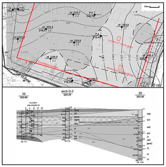 In terms of the design, there were no contraindications to start the works referred to above. A problem was, however, found given the execution of the works. The spacing of the geological boreholes available at that time was approximately 30 m (Figure 3). The depth of geological (profile) holes was reaching 17.5 m p.p.t. The interpolation of the formation of the roof of the load-bearing soils at such a great distance and considering their high variability causes the risk of different local conditions. A decision was thus made to conduct an additional survey using geological boreholes and CPTU probes, which were to allow for obtaining a more detailed mesh of boreholes previously made in that area. Based on the obtained results, a revision of the design of the improvement was planned. Simultaneously, the working parameters of drilling at which the condition of driving the columns in the load-bearing grounds will be fulfilled as provided in the design were established.