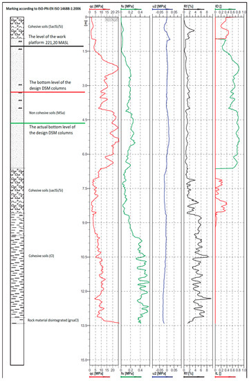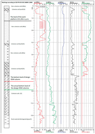 Based on the equations presented above and laboratory tests carried out, the plasticity level of cohesive soils present in the profile beneath the level of the designed foundation plate was established. It has been found that the resistance value of 6 MPa of the cone of the qc probe would mean that the proper depth for the base of the DSM columns has been reached.