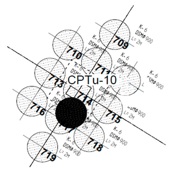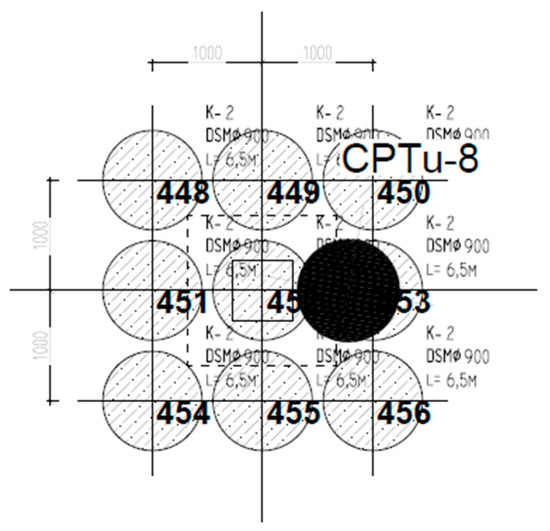While considering the geological and engineering documentation, the range of the zone of adverse soil conditions for the direct foundation of the building has been established. The weak soil was comprised of made grounds unfit for construction, sandy loams (IIIa and IIIb layer) with a liquidity index of IL 0.60 and silty loams with a liquidity index of IL 0.30–0.80, improved by Deep Soil Mixing. The columns were designed in the location of the load-bearing pillars of the building, in such a way that besides the transfer of the loads caused by the pillars, the columns would also partially transfer the loads caused by the weight of the floor and the service loads for a given category of the structure.