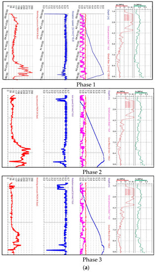 In addition, in Figure 8a, to directly compare the holes, CPTU parameters, and DSM processing parameters, individual phases are presented over the creation of an example column 454. The figure below it allows also, to evaluate the evolution of the treatment parameters with the number of adopted phases.