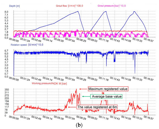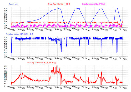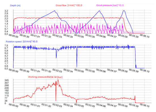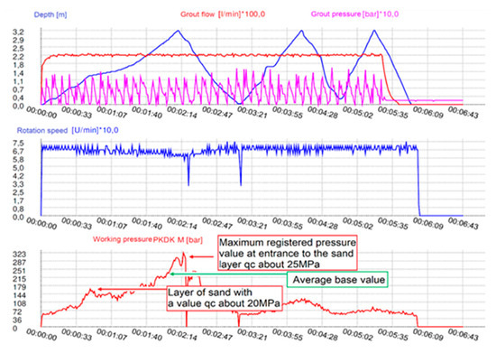 Subsequently, the representative column No. 714 (Figure 11) was made to determine the working pressure that should be registered using the device while driving the mixer into the stratum. While observing the graph produced by the automatic logger, one may not analogies to the qc resistance values registered while probing this location before. The surge of rotary drive pressure PKDK by a value reaching 162 bar at a depth of approximately 1 m exhibits the passage through the stratum of medium sand in which the qc value registered by the CPTU-10 probe amounted to 20 MPa. After passing through that stratum, a slight drop in the pressure follows the drop in the value of resistance at the cone, and subsequently, a rapid surge to 320 bar occurs at the depth of 3.23 m, which was also accompanied by a decrease in rotational speed. The noted working pressure surge was related to the fact that the mixer reached the medium sand with the density of ID 0.8 (qc—25 MPa) and it was assumed that the mean base pressure value should amount to at least 240 bar while achieving a rotation speed of 60 RPM, which would evidence the sufficient depth of insertion of the column in further considerations.