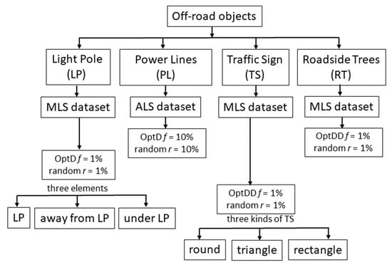 In this work the OptD method is used for the data reduction of datasets including off-road objects. In particular, the behavior of OptD is checked in four cases corresponding to the previously mentioned four categories of off-road objects. In all considered cases MLS datasets have been used in the tests done in this paper. It is worth to notice that, in the PL case, power lines were hardly noticeable in the MLS dataset. Therefore, ALS dataset has been considered in the results shown in this work.