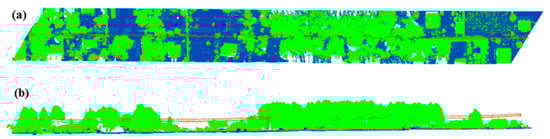 Classified ALS point cloud provided by Vimap: (a) top and (b) side view (green—objects above the ground: vegetation, buildings, blue—ground, red—power lines).