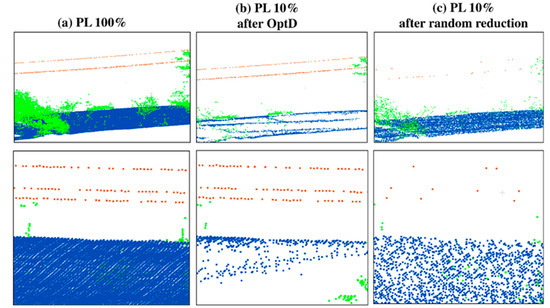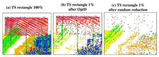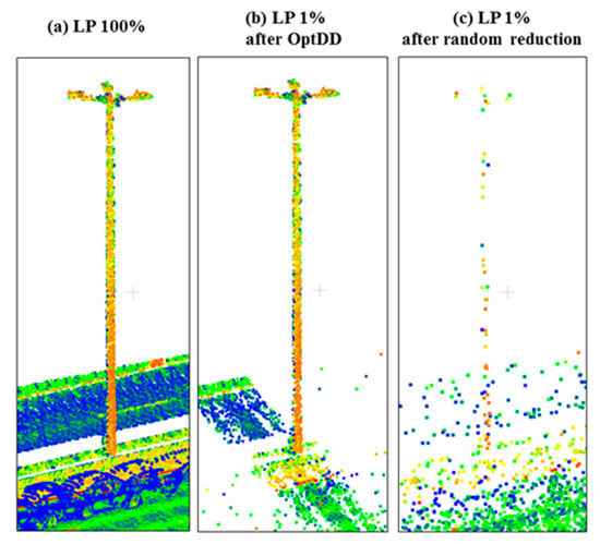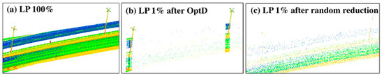 Figure 6 aims at clarifying the advantage of using OptD with respect to a random sub-sampling of the areas close to a light pole: Figure 6a shows the original point cloud, whereas Figure 6b,c show the point cloud reduced at 1% of its original size by means of OptD and random sub-sampling, respectively.