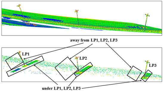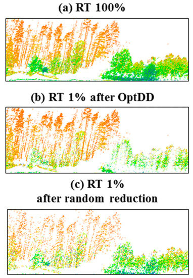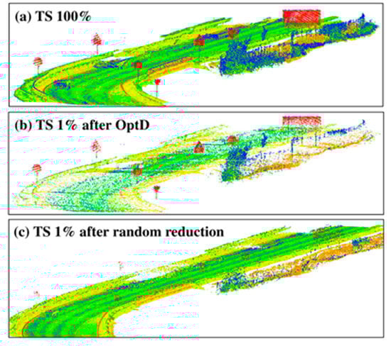 This subsection considers the effects of data reduction on the traffic sign points. Figure 7 shows the original MLS point cloud considered in this subsection (a) with those sub-sampled by using OptD (b) and with random down-sampling in CloudCompare (c).