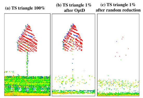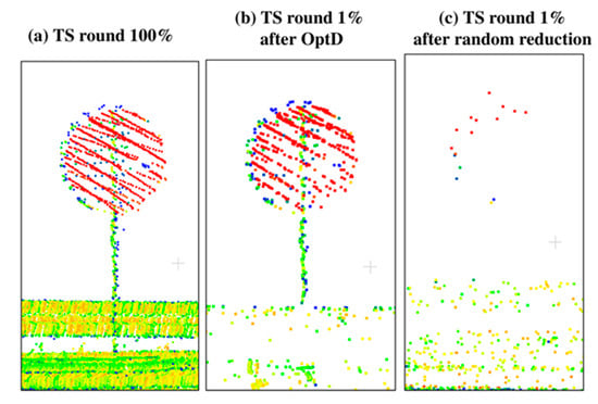 Point cloud of TS: (a) original, (b) after OptD method, (c) after random reduction.