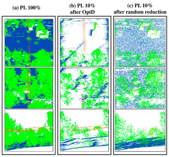 Figure 11 and Table 7 show that most of the PL points have been maintained by the OptD method, whereas the few PL points remaining after random sub-sampling are hardly visible. Interestingly, Table 7 also shows the different behavior of OptD for what concerns ground and trees/building points: the quite high geometric regularity of ground points caused a very high reduction for such category, whereas the data reduction for trees and buildings was less marked.