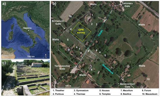 Location of Sepino on a Google Earth™ satellite image of Italy (a), map of the archaeological area of Saepinum with an indication of walls, main buildings, gates, and roads (b) and a picture of the decumanus flanked by private houses in a view from Bovaianum Gate in the direction of Beneventum Gate (c).