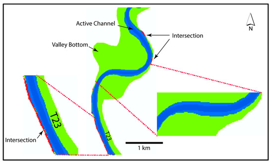 - it determines the contacts—both margins—between active channel and “inflated” (buffer) VB margin through a GIS intersection;