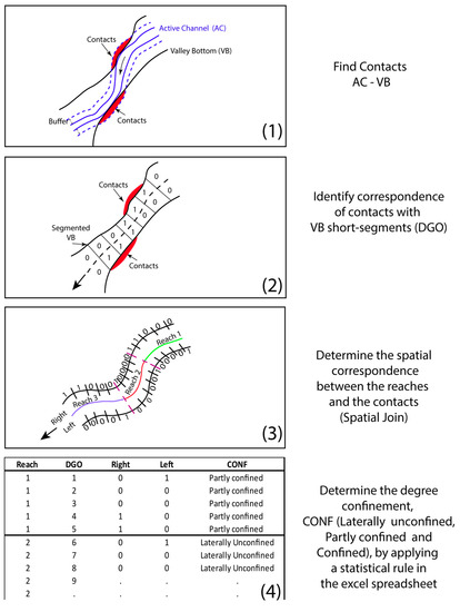 Steps for calculating Confinement: (1) Intersection between the valley bottom (VB) and a buffer of the Active Channel (AC) to determine contacts; (2) Determination of the correspondence between contacts and segmented VB (by applying mainly the FCT and obtaining the Discretized Geographical Objects (DGO)); (3) Determine the spatial correspondence between VB segments and contacts using the GIS tool “Spatial join”; (4) Determine the Confinement Type by applying a statistical rule using an Excel spreadsheet on the attribute table extracted from the segmented VB shapefile.