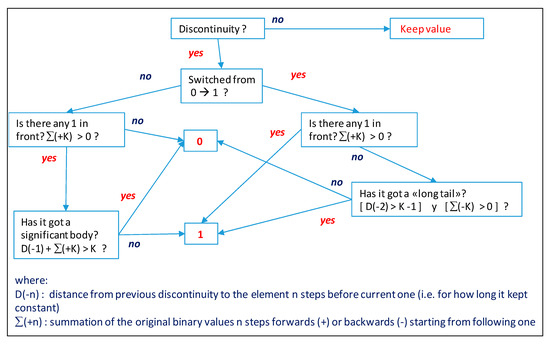 - if the current point is not a discontinuity, then just keep the original value of the variable; if it is a discontinuity, instead, “look forward and backwards” to ascertain whether the discontinuity is due just to a local effect (“absence’, i.e., a “hole”, or “presence”) or it is the beginning of a new reach within the significant horizon, and assign the new value accordingly (see Figure 8).