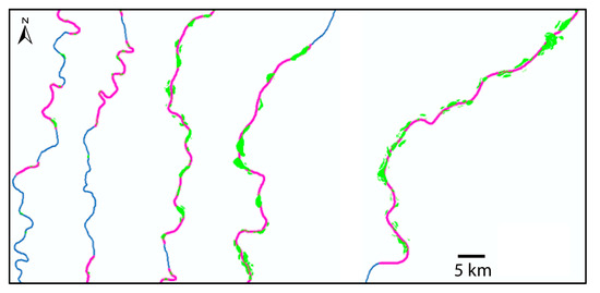 In general, the algorithm produces a somehow hysterical sequence of different confinement categories (in this case: mostly laterally unconfined with two shorter segments partly confined) and is not able to capture a more holistic character (indeed, we would classify the whole stretch as partly confined). Notice in Figure 4 that while the output of the algorithm is reported along the reference axis adopted (colored polyline axis: dark green: unconfined; light green: partly confined planform controlled; orange: partly confined valley margin controlled; red: confined (not detected in this figure along the axis)), to assess confinement one has to look at the blue polygon representing the envelope of active channels (which is wide or very wide where the river is anabranching or anastomosed), and identify sectors where it touches either margin of the VB polygon (grey area). Only the red contacts count because even though other lines seem in contact, visually, from a geographical point of view (GIS) they are not: sometimes, indeed, the difference amounts to a few meters only, but it is still larger than the tolerance adopted in the buffer used by the algorithm.
