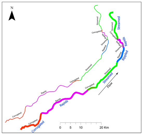 - Nardini, A.; Yepez, S.; Mazzorana, B.; Ulloa, H.; Bejarano, M.D.; Laraque, A. Geomorphic river characterization: A systematic, automated approach for river segmentation with case studies on the Magdalena River (Colombia) and on the Baker River (Chile). Water 2020. submitted. [Google Scholar]