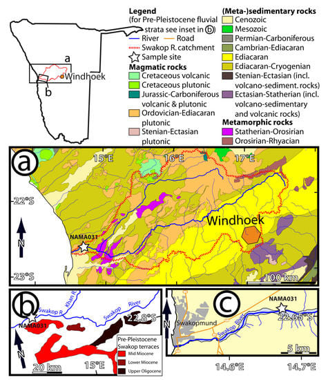 Geographic and geological overview of the study area and sampling site. (a) Geological map of the Swakop River catchment and its surrounding areas adapted from [44]. (b) Mapped Pre-Pleistocene terraces along the southern banks of the Swakop River [29] and references therein. (c) Sample locality of NAMA031 at the northern banks of the Swakop River east of Swakopmund.