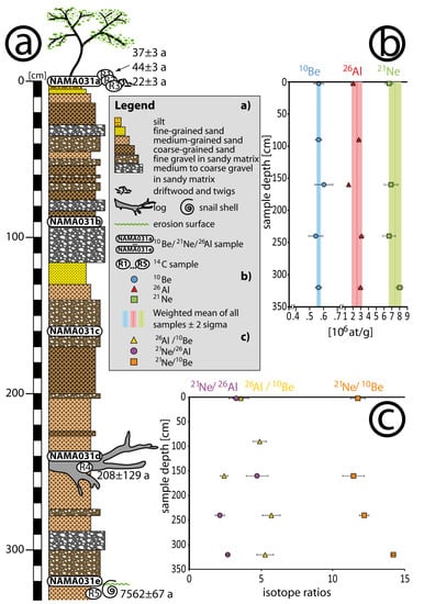 Except for the slightly lower 26Al concentrations of the surface sample NAMA031a and of sample NAMA031c, the entire profile exhibits a homogenous CN concentration with similar 26Al/10Be ratios. This supports the hypothesis of homogenised CN signals in very young fluvial deposits, at least for ephemeral river systems. Hence, essentially the entire production of the studied long-lived CN must have occurred during pre-exposure and/or sediment transport, while the in-situ production of CN after sediment deposition is negligible. Considering a maximum deposition age of 400 a, a Sea Level High Latitude (SLHL) production rate for 10Be of 4.02 at/(g a) [64] scaled using [65] and no additional correction like topographic or self-shielding for “after-deposition production” yielded maximum 10Be and 26Al surface concentrations of ca. 1800 and 11,700 at/g, respectively, which is far lower than the measured concentrations. This is further corroborated by 26Al/10Be ratios in a range of 2.42 ± 0.13 to 5.72 ± 0.31, which are depleted with respect to the production rate of 6.61 ± 0.52 [66] and indicate that the quartz grains must have been exposed to cosmic rays at the surface a long time before their deposition in the terrace. The same applies for the 21Ne/26Al and 21Ne/10Be ratios (Figure 2c).