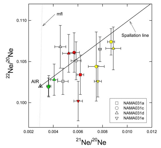 Neon three-isotope plot for stepwise heating and crushing data of NAMA031a, NAMA031c, NAMA031d and NAMA031e (grey—400 °C, yellow—600 °C, red—800 °C, green—crushing extractions). The 1200 °C data would plot out of scale far to the right (see Table 2). "Spallation line", i.e., mixing line of atmospheric and cosmogenic Ne, according to [56]. mfl: mass fractionation line. While the NAMA031a, NAMA031c and NAMA031d data are consistent with a two-component mixture of trapped Ne (as determined by the crusher extractions) and cosmogenic Ne, the 600 °C and 800 °C steps of NAMA031e may indicate the presence of some nucleogenic 21Ne in addition. 2 sigma uncertainties are shown.