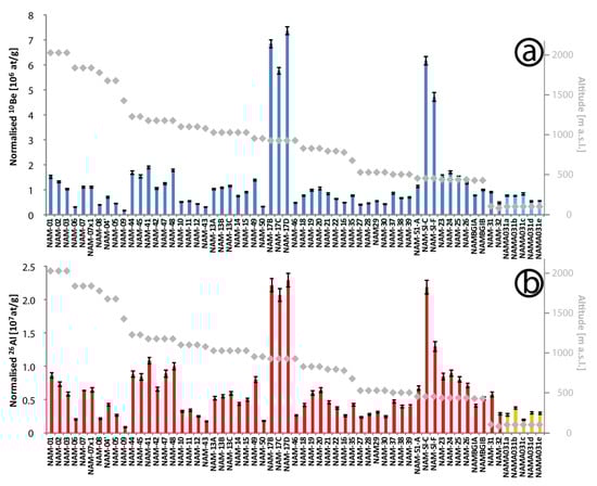 Normalised (a) 10Be and (b) 26Al concentrations versus altitude of the sample location in samples of [27] and from this study (the five rightmost samples of panels a and b, i.e., NAMA031 a-b-c-d-and e).