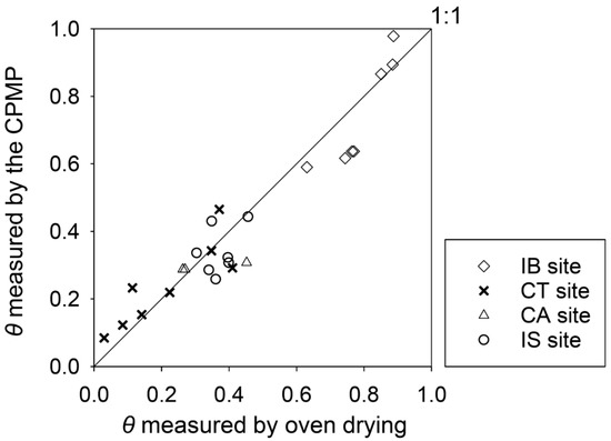 3.1. Comparison of θ Measured by the CPMP and the Gravimetric Method