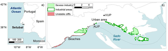 Coastline land use of the studied area: (a) Location of Setubal municipality; (b) Main areas including the Albarquel Urban Park (AUP) and the Varzea Urban Park (VUP). Adapted from [13,14].