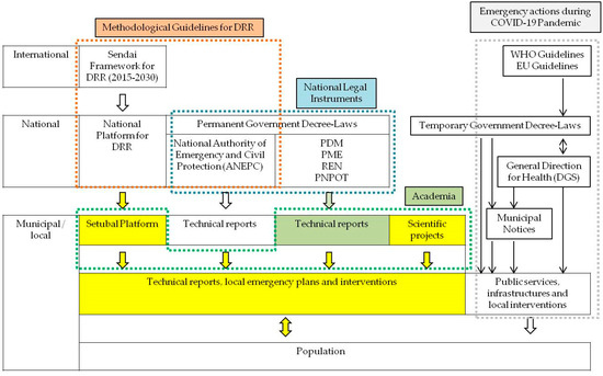 Schematic tools to cope with natural disasters and the current COVID-19 pandemic at international, national and the municipal/local levels. Highlighted in yellow are the strategy tools created by Setubal municipality.