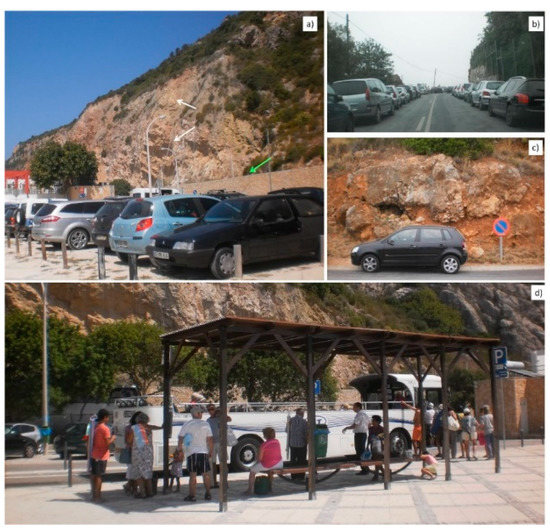 West part of Setubal: (a) Parking lot at a beach. White arrows: unstable cliffs protected by a net. Green arrow: reinforced wall is a secondary protection from falling debris (adapted from [13]); (b) road with parked cars; (c) people parked even on forbidden spots; (d) as of 2018, a shuttle bus was on service for free.