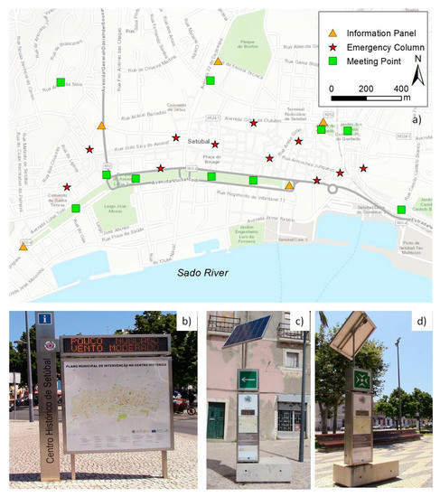 Given the above reasons, the Municipal Plan of Intervention to the Historic Center [22] was implemented in 2010 to increase citizens’ resilience, provide the residents with practical tools for a safe evacuation. The intervention plan [22] consists mainly of an evacuation map of the historic area (Figure 5a). Quite innovative is the implementation of a variety of equipment throughout the city center area: five Information Panels, 11 Emergency Columns, and 10 Meeting Points, as presented in Figure 5b–d. The information panel (Figure 5b) allows the dissemination of written messages in real-time. The installed equipment is a unique case in Portugal and it should serve as a guideline to other municipalities and countries, as well as in Portugal.