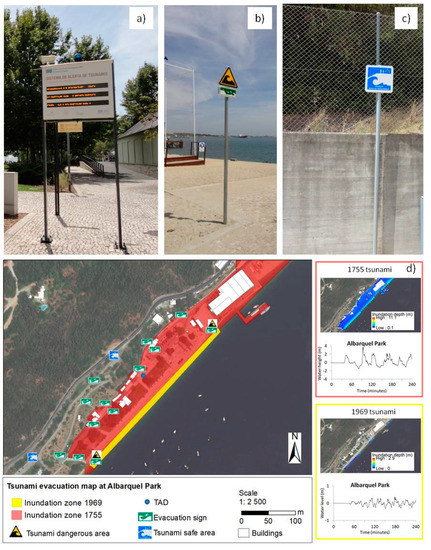 More recently, tsunami mitigation and awareness strategies were implemented. In collaboration with a scientific team [36], the use of the tsunami numerical modeling allowed a more detailed understanding of the 1969 and 1755 tsunamis on the Setubal coastline [13], showing the municipality would be hit within 30–40 min an earthquake. In addition, the tsunami evacuation map was produced (Figure 6). What is innovative is the installation of several evacuation signs at the Albarquel Urban Park (Figure 6b,c).