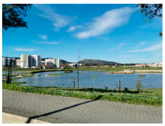 Previous reports show the Setubal urban area (location in Figure 1) is prone to urban floods, usually within a period of fewer than 6 hours [25,27]). As a result, the Varzea Urban Park was created as a retention basin for floods. As shown in Figure 7, it has several artificial lagoons to retain, control and drain the water. The construction of the park is not yet completed, but the first phase showed it to be very useful to mitigate urban floods after the Elsa and Fabien storms that occurred December 16–21, 2019. The concepts of Flood Resilience Measurement for Communities (FRMC) [39] offer the structured means and can be recommended for further action.
