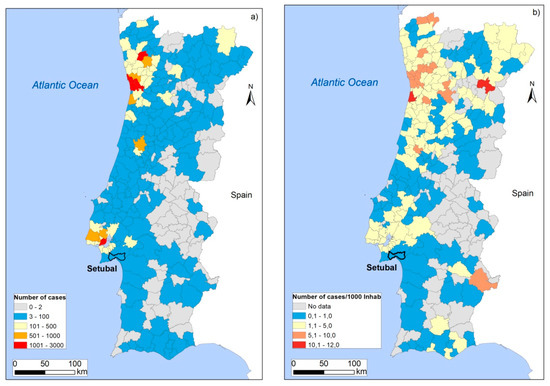 Geographic distribution of infected cases due to COVID-19 in Portugal mainland on May 19, 2020: (a) Number of infected cases on each municipality; (b) Number of infected cases per 1000 inhabitants on each municipality. (Data compiled from [41,42,45]. When less than three cases were reported, data are not shown).
