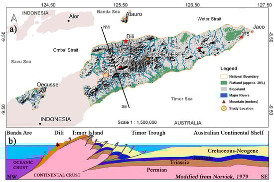 (a) Simplified geomorphology of Timor-Leste and (b) illustration of the mountainous characteristics of the island, with fragmented and chaotic structures of thrust and fold zones [].