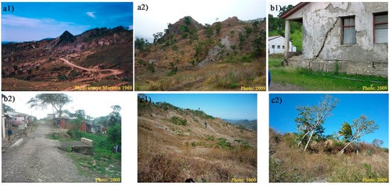 Some previous works have confirmed these factors that influence the dynamic process of the geological and tectonic formations of the island. Audley-Charles [] considered the tropical rainfall as the factor responsible for the rugged topography of the Bobonaro region characterized by deep gullies, landslides, and knobby hillsides, as shown in Figure 3. Due to the location of Timor Island in the arc-collision zone [,,,,,,,], Norvick [] illustrated the tectonic mechanism and high seismic activity reflected in the mountain characteristics, followed by the fragmented and chaotic structures of the thrust and fold zones shown in Figure 1b.