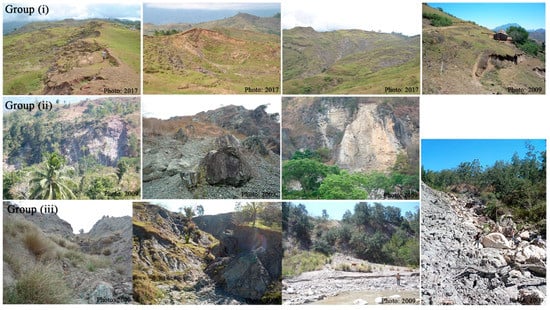 Types of ground deformation mechanisms in the Bobonaro Region: Group (i) located closest to crest of a mountain, Group (ii) on a steep slope, and Group (ii) at the base of slopes and close to water courses.