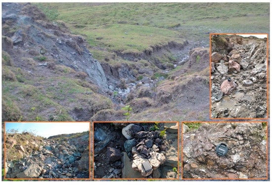 The processes of ground deformation and landslides observed in the Bobonaro region are herein described following the Varnes [] classifications. The types of mechanism vary from simple and isolated occurrences to more complex ones in a chain sequence from the peak of the mountain to the base. Figure 3 illustrates the types of mechanism and their locations classified into three groups: (i) slopes closest to the top of the mountain; (ii) steep slopes or ravines; and (iii) more at the base of the slopes—that is, specifically in the areas near watercourses.
