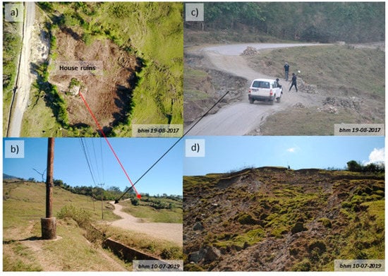 Evidence of ground deformation and its impact: (a) house ruins, (b) electrical pole that moved and tilted, (c) degraded road conditions, and (d) small landslide induced by an earthquake.