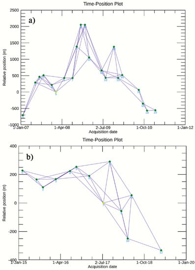 For the PALSAR1 data, the maximum perpendicular and temporal baselines of the interferogram for SBAS processing are ±2000 m and 270 days, respectively. Accordingly, 55 pairs of interferograms met the criteria. For the PALSAR2 data, the maximum perpendicular and temporal baselines of the interferogram for the SBAS processing are ±400 m and 365 days, respectively. Thus, 33 pairs of interferograms met the criteria for further processing. Figure 7a,b shows the baseline table of SBAS DInSAR for PALSAR1 and PALSAR2, respectively.