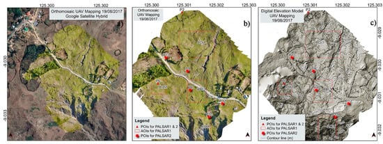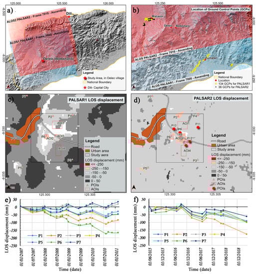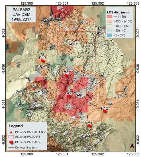 The ground deformation detected by SBAS DInSAR from both PALSAR1 and PALSAR2 is presented in line of sight (LOS) displacement values and their spatial distribution (Figure 8c,d). These LOS displacement values were furthermore used for geoprocessing in GIS software environments. Seven points of interest (POIs)—namely, P1, P2, P3, P4, P5, P6, and P7—were defined around the study area near the village of Oeleo (Figure 8c,d). In order to identify the distribution of ground deformation with more detail, four areas of interest (AOIs)—AOI1, AOI2, AOI3, and AOI4—were defined (Figure 8c,d). These AOIs were applied for the first period. Six more POIs—namely, P8, P9, P10, P11, P12, and P13—were defined for the second period (Figure 8d). The definitions of the additional POIs and AOIs were based on the LOS displacement images, the recent field observations, and UAV orthomosaic image interpretation. The LOS displacement values were extracted and converted to points for further analysis. The PALSAR1 and PALSAR2 LOS displacement time-series related to P1, P2, P3, P4, P5, P6, and P7 are presented in Figure 8e,f respectively.