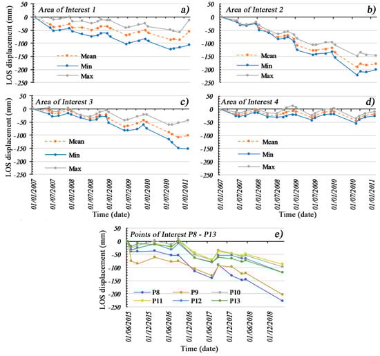 The PALSAR2 LOS displacement time-series values related to P8, P9, P10, P11, P12, and P13 were extracted and are presented in Figure 9e. Based on the LOS displacement values, both POIs—P3 and P7—seemed more constant than the others during the first period. However, during the second period, P3 and P7 presented displacements as well. POIs P2 and P6 presented very high values of LOS displacement during the two periods (Figure 8e,f). In Figure 9e, P8 and P9 showed LOS displacement values of more than 200 mm compared to other POIs.