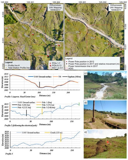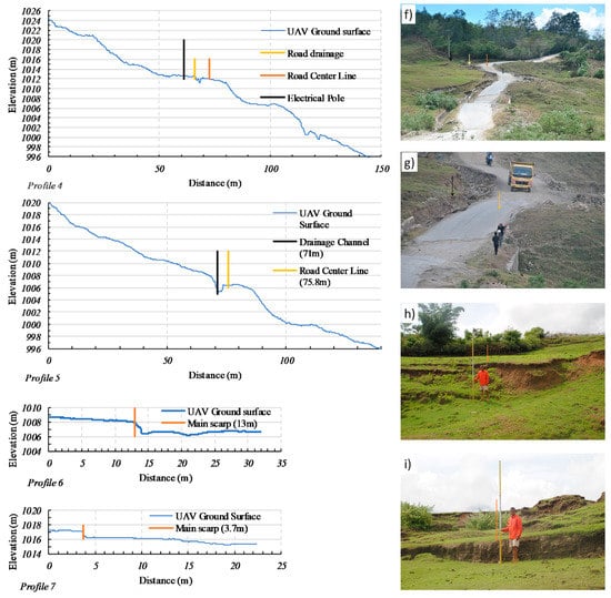 The very high-resolution orthomosaic images and DEM allowed for a more detailed interpretation of the morphology of the ground surface deformation []. Specific terrain profile sections were extracted from the UAV DEM (Figure 13a). For each profile section, the ground surface as well as the remarkable ground features and objects are presented in the graphs (Figure 13 and Figure 14). The results show that the ground surface deformation measurements vary from centimeters to meters in both the vertical and horizontal directions. From Profile 1, the results of the road surface elevation extracted from UAV DEM are presented and compared with the total station measurements. The graph shows a good coherence between these two measurement methods (Figure 13c). The line of Profile 2 follows the electrical pole line. It is noted that the electrical pole moved horizontally more than 4 m from the initial position (Figure 13b,d). Profile 3 represents the natural ground surface condition and a ground crack, shown in Figure 13e. Profiles 4 and 5 represent some parts of the roads that were affected by the ground deformation (Figure 14f,g). Profiles 6 and 7 represent the main scarps that were measured and illustrated in Figure 14h,i, respectively.