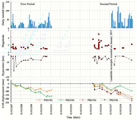 It is well known that the occurrence of an earthquake with a certain magnitude or greater triggers the reactivation of landslides. However, the influence does not always appear immediately after the earthquake. On the other hand, heavy or long rainfall events induce landslides and/or changes in the ground, and their influence can appear a relatively short time after the event under specific ground conditions. This is because the time it takes rainfall water to infiltrate into the ground depends on the degree of development of the catchment areas, the permeability of the ground, and the presence of cracks in the ground [,]. Considering the above characteristics, it can be denied that the timing of ground deformation, earthquake events, and periodic rainfall are clearly related to and based on the results of the LOS displacement time-series for either period. As a practical approach, Figure 15 presents important information that should be considered as complementary data for this study. In future works, a more precise approach will be needed to reach an acceptable conclusion.