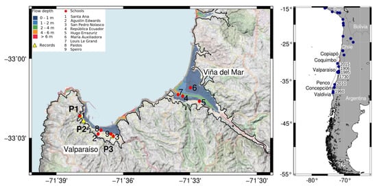 Left panel: Map showing the extent of maximum tsunami inundation according to the Tsunami Inundation Chart for Valparaíso and Viña del Mar [3]. Yellow triangles show the data of the tsunami inundation extent based on historical records along Valparaíso. P1 stands for the location of La Matriz church where historical records indicated the maximum wave height of 9 m. P2 stands for the location of the Augustinian convent where historical records reported the maximum wave height of 11 m. P3 stands for Mercedarian convent where the maximum wave height reported in historical records was 9 m [1,4]. The contour line of 30 m above sea level (m.a.s.l.) is shown in black. The numbers refer to the schools where talks were given. The right panel shows the location of selected coastal cities in Chile. Blue circles stand for approximated earthquake epicenters greater than Mw 8.0 in the year 1500–2020 (the year of occurrence is given for selected events). The earthquake locations are based on ComCat [5].
