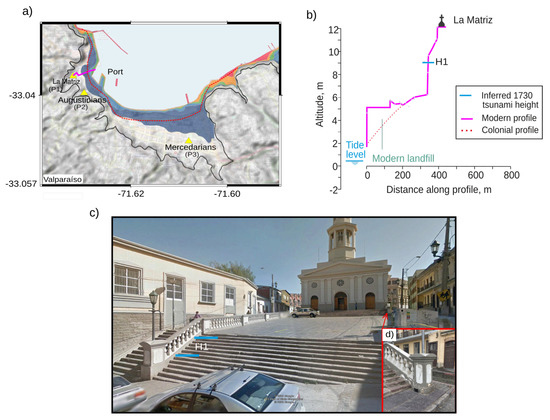 (a) Map showing the extent of maximum tsunami inundation and flow depths according to the Tsunami Inundation Chart for Valparaíso and Viña del Mar (CITSU, in Spanish) according to [3], as well as the location of the maximum tsunami height reported in historical records (yellow triangles) shown also in Figure 1; the profile line is shown in magenta, and the colonial coastal line [1] is shown in red. (b) The topographic profile along La Matriz (P1), where tsunami records suggested a 9 m tsunami height (light blue line), modified from [1]. (c) Photo of La Matriz Church (provided by Google Maps [9]), where light blue lines indicate the estimated position range of the maximum tsunami height recorded for the 1730 event and the red arrow shows where a plate was supposed to be located (refer also to the first section of Supplementary Material 1).