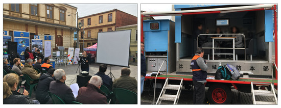 For this, the main activities developed started with material that could be easily adapted for different members of the public, such as talks to students, educational material for different ages, a mobile earthquake simulator (Figure 3), interactive activities, brochures, handouts, and projection mapping tsunami inundation models. The local agents of ONEMI have a channeling role in these kinds of events as an entity in charge of emergencies at the regional and national levels. In this case, ONEMI was in charge of the earthquake simulator and disseminated information for a community drill issued for 30 September 2019, where at least 110,000 people participated in Valparaíso and Viña del Mar. The commemoration ended with a round table discussion (public debate) where the policy paper “Vertical evacuation as a measure to mitigate the risk of tsunamis in Chile” [26] was presented and discussed with invited Chilean authorities.