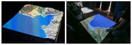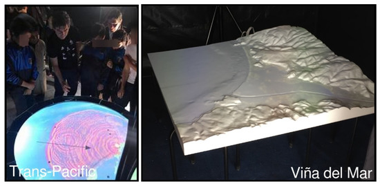 The projection mapping of tsunami inundation allowed students and the general public to understand the tsunami process and the extent of inundation in different cities around the country. In Table S2, CIGIDEN’s outreach activities related to tsunami risk during 2019 are summarized, reaching approximately 30,400 visitors throughout the country. In particular, for this event, the simulations shown in Figure 5 were used for projection over the scaled relief mock-ups (Figure 6). They allowed the participants to envision the extent of the inundation in Valparaíso and Viña del Mar.