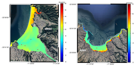 Resulting maximum wave heights in Viña del Mar (left panel) and along the coastal city of Valparaíso (right panel). The seismic source used as the initial condition was based on [1]. Red points stand for the locations of schools shown in Figure 1.