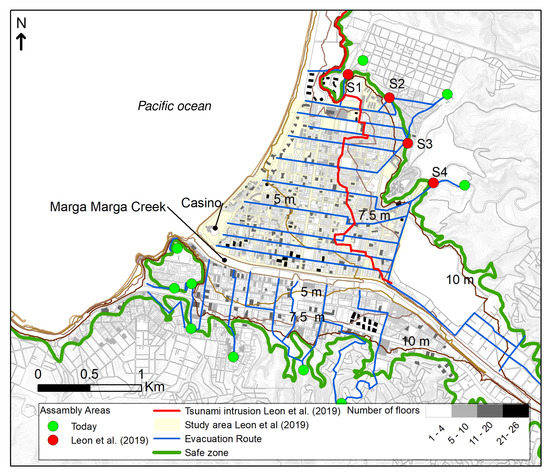 Map of Viña del Mar’s downtown. Green dots are the assembly areas in case of a tsunami; green lines demarcate the safe zone; blue lines are the tsunami evacuation routes; these three have been established by the municipality to date. Brown lines are contours every 2.5 m. The gray scale indicates the number of floors of existing buildings. The Población Vergara neighborhood (yellow colored area) maximum tsunami inundation extent [31] is delimited by the red line. Four assembly areas are shown (red dots).
