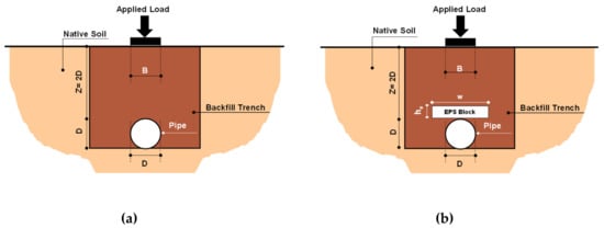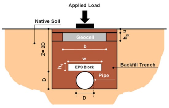 Buried pipes are a vital part of urban infrastructure, and their performance has a direct link with their serviceability. The performance and durability of these vital substructures depend on their safe and proper design to preserve their safety and operation. One of the approved practical advantages of geosynthetics is their performance in stress attenuation on buried conduits and pipes; thus, this area has been investigated by many researchers [2,3,4,5,6,7,8,9,10,11,12,13,14,15,16,17,18]. Anil et al. [2] studied the performance, strength, and energy absorption competency of EPS blocks over buried pipes against impact forces. Their investigation used a drop-weight impact testing apparatus. Their results show that all protective layers affect the behavior of pipes positively. However, the best performance was obtained from the thickest EPS block. Hegde and Sitharam [5] conducted experimental studies to explore the effects of using a combined arrangement of geocell and geogrid reinforcement to protect a buried pipe. Their results show the use of both geocell and geogrid reinforcements have a more significant reduction in the deformation of a pipe compared with using only geocells or geogrids. Beju and Mandal [4] addressed the behavior of a flexible pipe buried in fly ash material in which a geofoam block is implemented. The best location of EPS blocks above the pipe was found to be less than or equal to 20% of the diameter of the pipe. Furthermore, their results showed that combining jute geotextile with higher density geofoam gives better results than lower density geofoam to improve the performance of the buried pipes. Azizian et al. [3] addressed the effect of an EPS block and geogrid layer on the behavior of buried pipes subjected to a simulated traffic load. Their results indicate that the dimensions of geofoam blocks in the embedded soil trench have an influential role in the behavior of the embedded pipes. Moghaddas Tafreshi et al. [14] analyzed the behavior of pipes buried under a protective layer of geocell and EPS geofoam blocks with flexible arrangements. Their results indicate that the combination of a geocell layer with EPS geofoam blocks has significant effects on ameliorating the behavior of the embedded pipe.