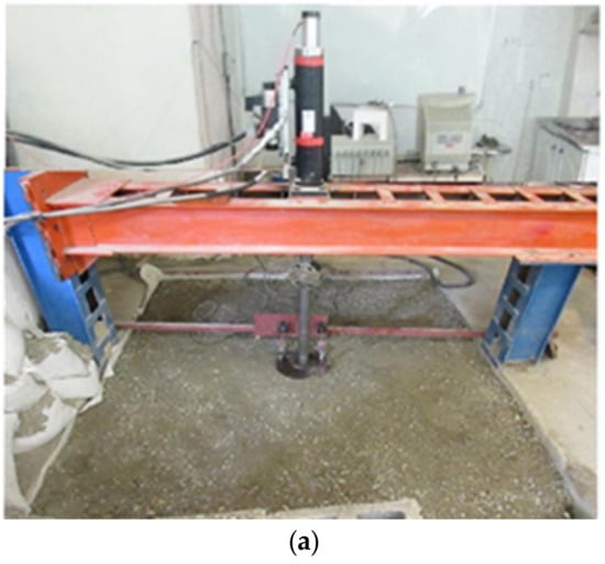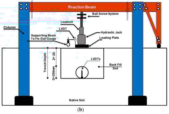 In order to compact the backfill layers over the pipe, a walk-behind vibrating plate compactor, 450 mm in width, was used. In all tests, the unreinforced soil layers with an optimum moisture content of 5% and wet unit weight of 19.72 kN/m3 were prepared and compacted to a thickness of 50 mm (first pass of compactor) and then 75 mm (second pass). When the backfill was complete, the loading plate with 250 mm diameter (B= 250 mm equals to pipe diameter) was set exactly in the center of the backfill and two LVDTs were installed to record the settlement at the loaded surface. In order to simulate the loads imposed by traffic, a load replicating a heavy vehicle half-axle (40 kN), such as that found on a typical heavy trailer (mean tire pressure 792 kPa), as recommended by Brito et al., 2009 [27] was exerted over a rigid plate with a diameter of 250 mm placed at the center of the trench (Figure 3).