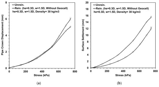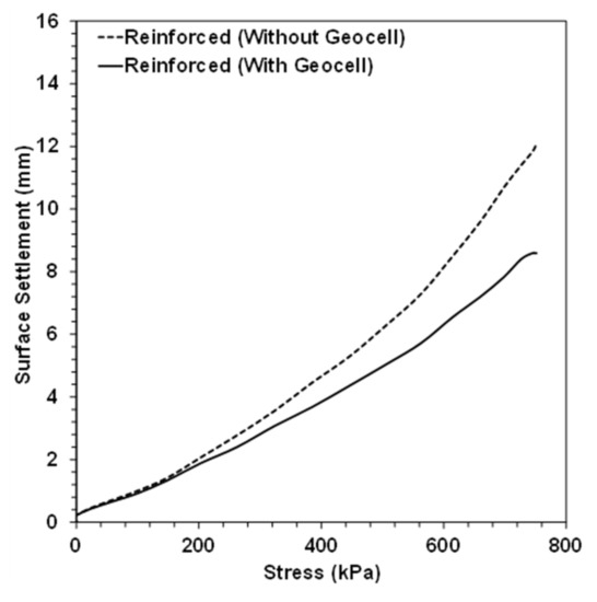Figure 14 shows the level of surface settlement against applied stress in the presence of a single geofoam block and a geofoam block with a geocell layer. In this case, the geocell layer reduces the maximum loading settlement by 29%. This provides further evidence that the geocell reinforced system reduces the pipe deformation and decreases soil surface settlement.