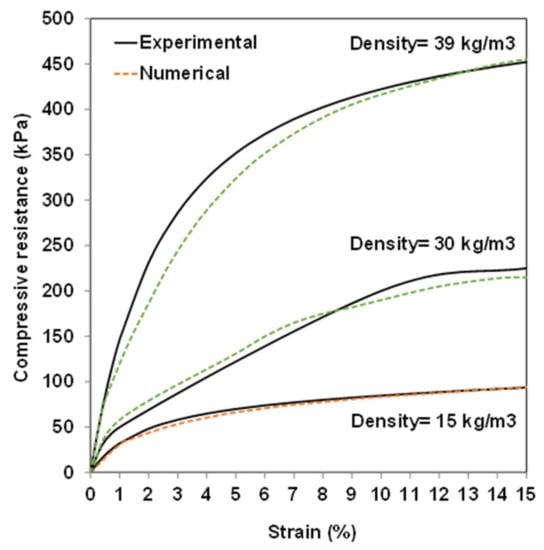 The behavior of EPS materials can be obtained with the required densities from these parameters. Subsequently, the elastic-plastic behavior can be converted from the nominal test data into its true values and then the total strain values decomposed into elastic and plastic strain components to allow for direct data input into ABAQUS. This approach uses the algorithm mentioned in another research paper [32]. Unconfined uniaxial compressive testing (ASTM D 1621-00 [33]) was performed on 200 mm cubic specimens of EPS with a density of 30 kg/m3 and direct stress-strain; the response was used in the numerical analysis. It is worth mentioning that the elastic limit and compressive strength of EPS geofoam are defined as the stress at 1% and 10% strain, respectively [34]. Figure 6 shows the verification of experimental and numerical analyses for employed EPS blocks. As is clear, the proposed model is capable of monitoring the EPS blocks’ behaviors with high accuracy.